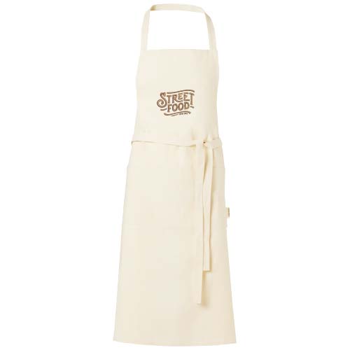 Avental feito de 100 % algodão orgânico de 200 g/m² com certificação OCS originário da Índia, com 2 bolsos adjacentes com um tamanho combinado de 45 x 20 cm e um cordão de atar nas costas de 1 metro. Comprimento da alça do pescoço: 55 cm.