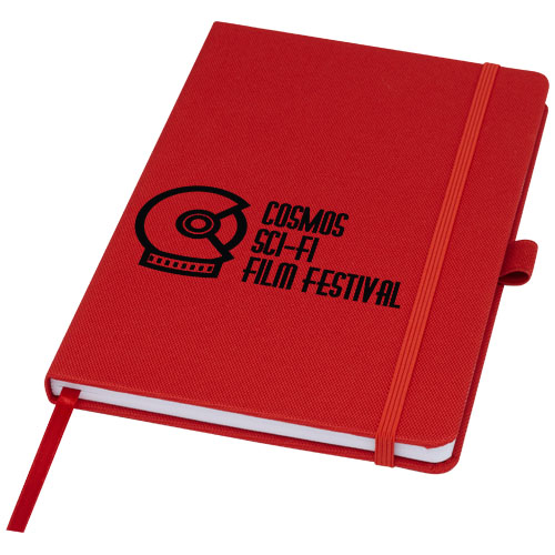 Caderno A5 com capa feita em tecido RPET. Possui 80 folhas de 70 g/m² de papel reciclado pautado, uma alça para caneta e marcador de fita.