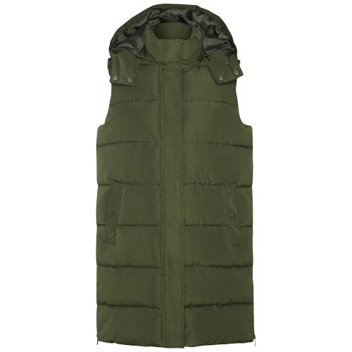 Colete térmico acolchoado com capuz removível. Gola alta. Fecho de correr frontal oculto por aba. Dois bolsos com molas de pressão. Aberturas laterais com fecho de correr Acesso interior ao peito. Repelente à água.